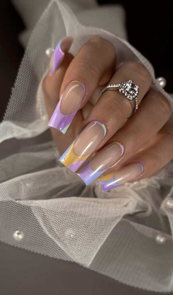 - «Вне белого». Популярны неоновые, пастельные или насыщенные цветные лайны вместо классических белых. Современно и смело смотрится нежная база с яркими или темными кончиками: зелёными, синими, коричневыми, бордовыми. Для смелых образов — радужный френч, где на каждом ногте — свой цвет.