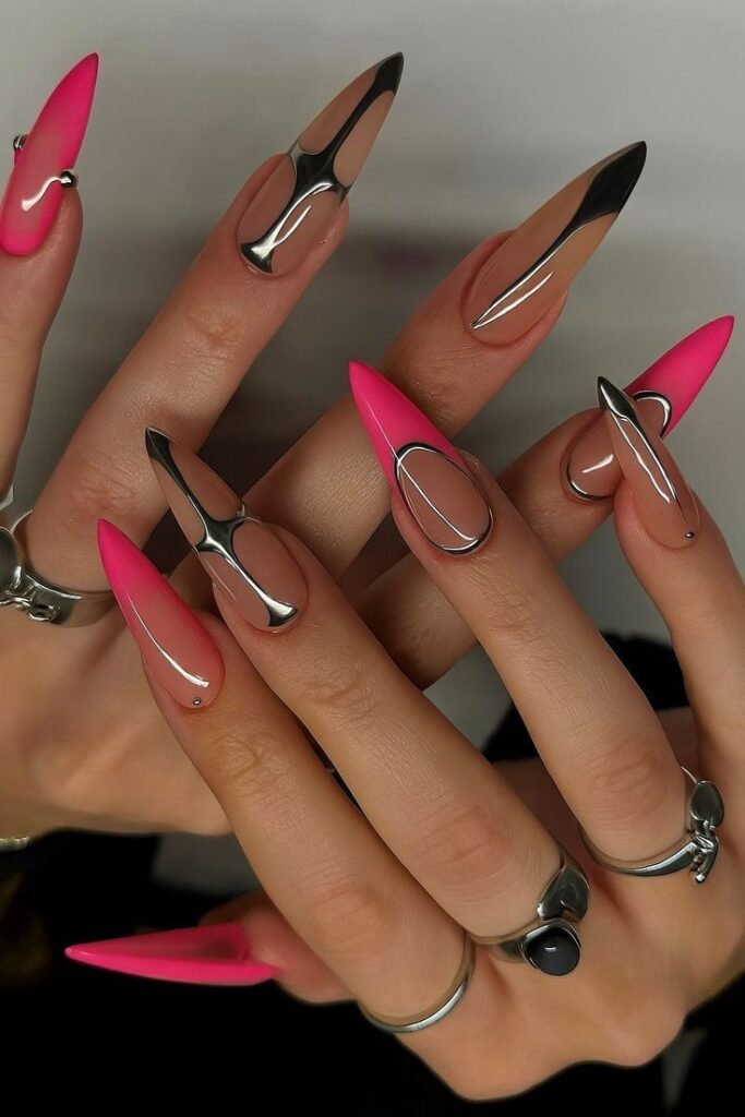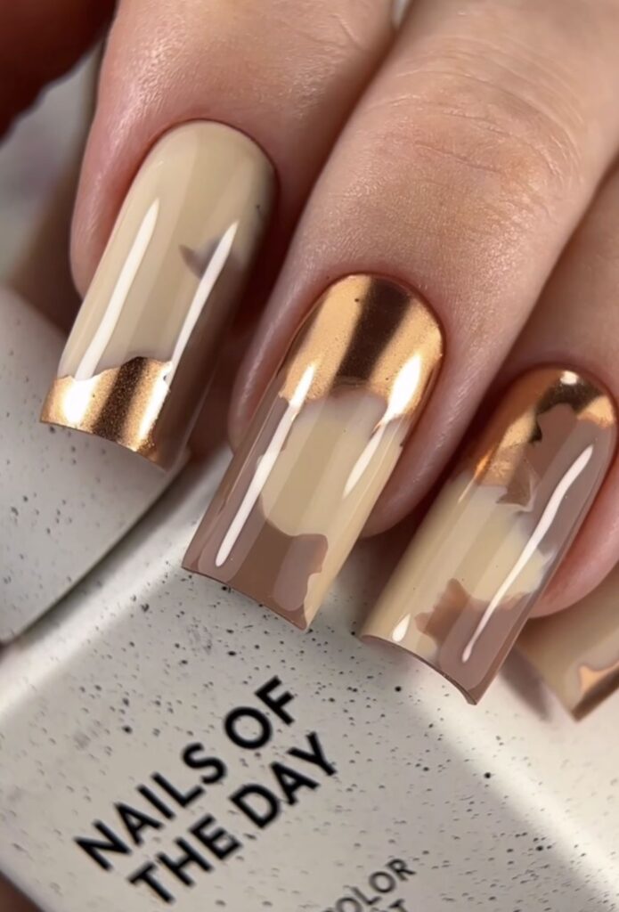 - Глянцевый, металлический, хром и блеск. Один из трендов — хромированный френч: с мягкой, нейтральной базой и металлической, блестящей линией на кончике.