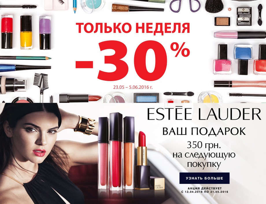 До 5 июня действует скидка 30% на косметику и парфюмерию Yohji Yamamoto, Marc Jacobs, Roberto Cavalli, Dr. Sebagh, Make up Factory, Orlane, Ayres, Skincode, ANNY, Moana, Institut Arnaud, Alfaparf, Shakira, United colors of Benetton, Elie Saab, Gemology, Methode Jeanne Piaubert, Dunhill, Jimmy Choo, Trussardi, Loewe, Lancome, June Jacobs, Gosh, Shiseido. Скидка по дисконтной карте не суммируется. До 7 июня в магазине Brocard в ТРЦ Ocean Plaza действует акция «Скидка до 50%» на определенные группы товаров, кроме подарочных карт и продукции Kiehl’s. Количество акционного товара ограничено. Карта на скидку выдается каждому покупателю в период проведения акции. До 12 июня при покупке линии ENERGIE DE VIE от Lancome на набор из трех продуктов действует специальная цена 3499 грн. До конца месяца в сети магазинов Brocard, приобретая продукцию Estee Lauder на сумму от 1500 грн, покупатели получат скидочную карту на сумму 350 грн. До 29 мая при покупке двух продуктов Lirene в подарок – BB cream, при покупке двух продуктов Dr Irena Eris – жидкий карандаш для глаз. До 12 июня при покупке продукта для лица марки QIRINESS подарок – дорожный набор. Также до 20 июня на туши Clarins действует специальная цена. Подробности – на Letu.ua и Brocard.ua.