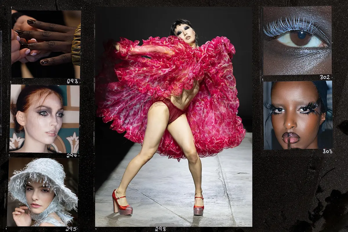 На показах Ashish и Marques Almeida царил принцип «чем смелее, тем лучше»: блестки, графические линии, вдохновение 30-ми, 70-ми и культовой Элизабет Тейлор – глаза стали главным акцентом образа. Визажисты использовали Dazzleshadow Liquid Eyeshadow от Mac и палитры Charlotte Tilbury, создавая настоящие шедевры на веках.