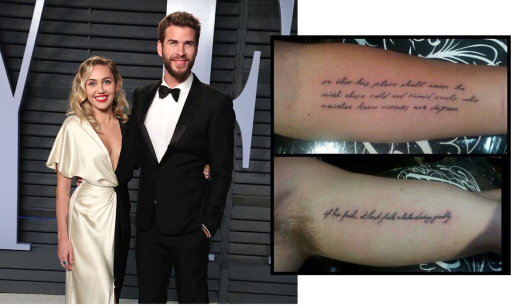 У пары, которая неоднократно сходилась и расходилась, также были парные татуировки. Они выбирали сдержанные символы с глубоким личным содержанием. В 2012 году Майли и Лиам сделали тату с цитатами Теодора Рузвельта. У Лиама – строка о смелости при поражении, у Майли – продолжение цитаты об отваге и отсутствии страха. После окончательного разрыва татуировки остались как память о важном этапе жизни.