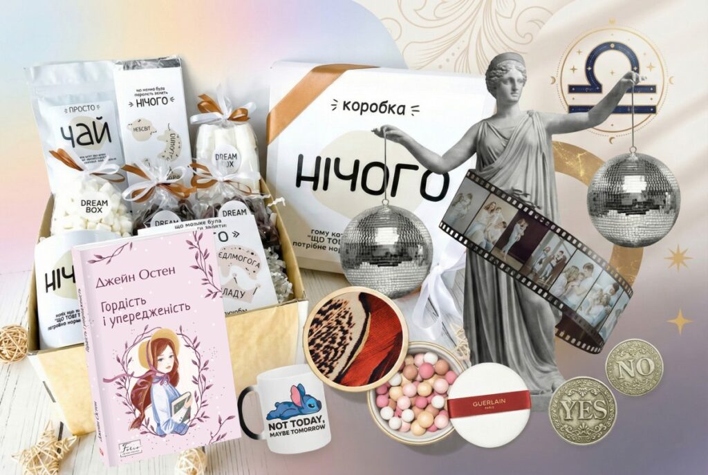 - Подарунковий бокс «Нічого» – справжній гіт для Терезів, які в звичайному житті відповідають: «Та нічого не треба!» на запитання про подарунки. Іронічно, але практично: навіть «нічого» може стати вдалим подарунком для тих, хто цінує легкість і гумор.