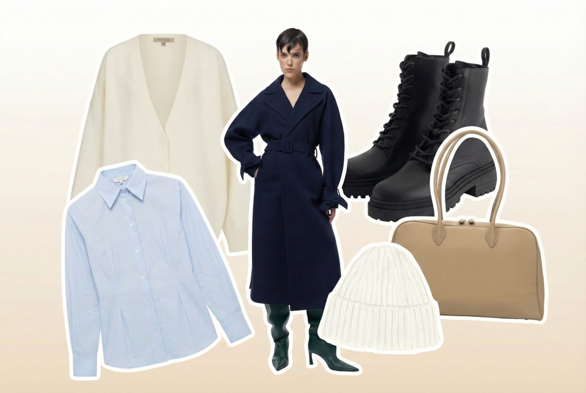 В першу чергу, якісне утеплене пальто прямого або трохи оверсайз крою, костюм (брючний або зі спідницею), який легко міксується з трикотажем, вовняні штани зі стрілками, теплий гольф або тонкий кашеміровий светр для багатошарових образів, сорочку з щільної бавовни або віскози, трикотажну сукню міді, а також чоботи структурованої форми, ремінь і мінімалістичні прикраси, які доповнюють образ.