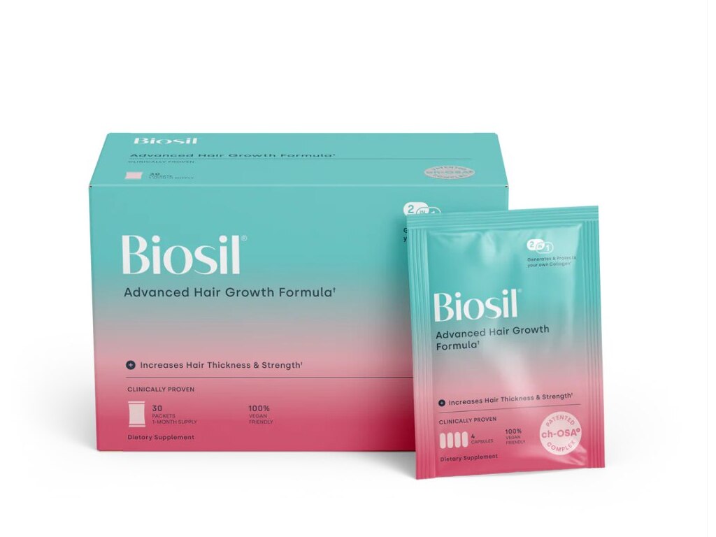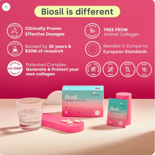 Biosil Advanced Hair Growth Formula — новий засіб для покращення росту волосся працює з середини, зміцнюючи пасма, стимулюючи вироблення колагену та підтримуючи ріст нового волосся. Клінічно перевірений, веганський та виготовлений за європейськими стандартами, Biosil є генератором колагену, а не добавкою колагену, підтримує волосся на кожному етапі його природного циклу росту.