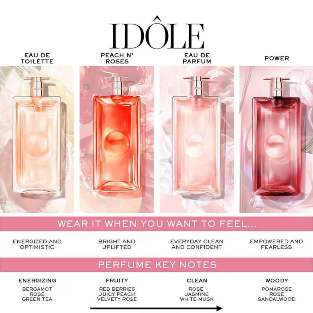 Нагадаємо, до сьогодні серія Lancôme Idole налічувала 6 ароматів. Так, Lancôme Idôle Eau de Parfum – оригінальний аромат, випущений першим у 2019 році. Згодом вийшли: Idôle Aura (яскравіша, свіжіша версія, Idôle Nectar (гурманська інтерпретація), Idôle Now, Idôle Power та Lancome Idole туалетна вода.