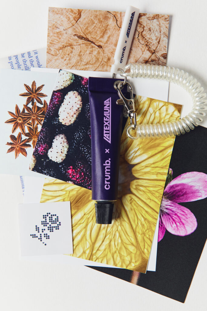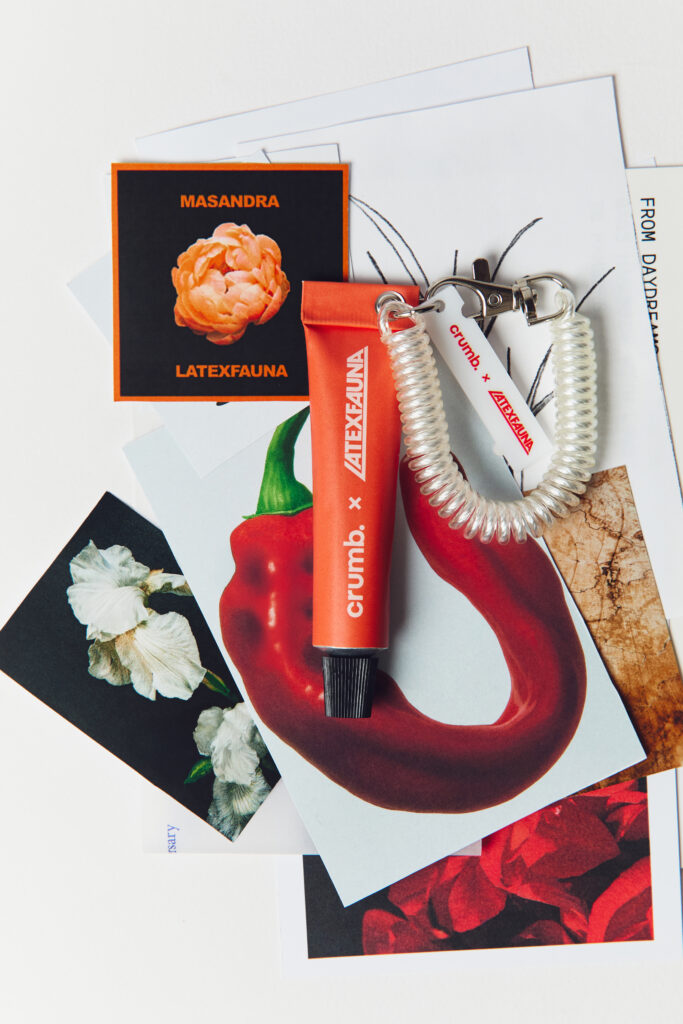 Мінікреми для рук Latexfauna × crumb предствлені чотирма ароматами. Кожен аромат має на упаковці цитати з треків. Так музика буквально «оживає» на шкірі – її можна не лише слухати, а й відчути. У наборі — брелок зі spotify-кодом, що веде прямо на трек і пружинний карабін.