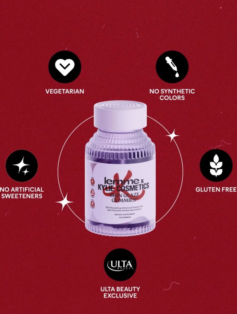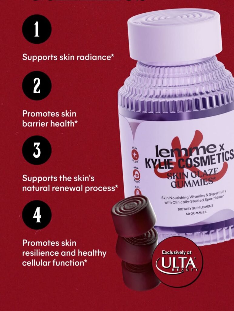 «Соковита» шкіра починається із розумних інгредієнтів. Жувальні цукерки Lemme x Kylie Cosmetics Skin Glaze Gummies містять спермідин, клінічно досліджену поживну речовину для довголіття, яка підтримує красу та здорове старіння на клітинному рівні, а також суперфрукти, що роблять шкіру гладкою, та антиоксидантні вітаміни A, C та E.