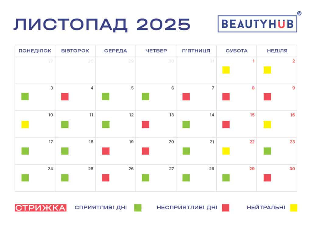 День сприятливий для підтримуючих стрижок, коригування довжини, видалення посічених кінчиків. Можна робити укладання та догляд за волоссям, маски та живильні процедури. Не рекомендується кардинальна зміна образу чи експериментальні стрижки – цього дня краще зберігати стабільність.
