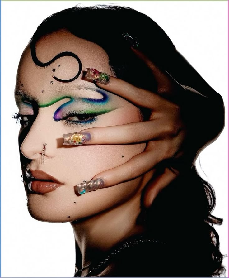 - Glitchy Glam. Усі будуть у захваті від несумісного манікюру, двоколірної помади та яскравих тіней для повік у двох бінарних відтінках.