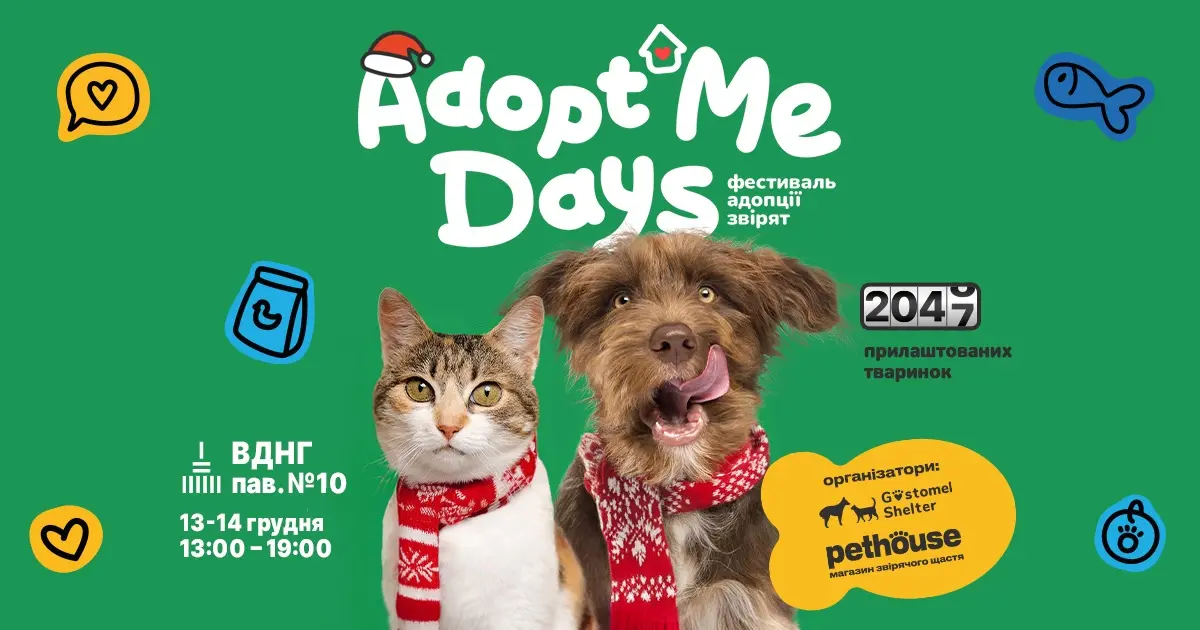 13-14 грудня 2025 року у 10-му павільйоні ВДНГ пройде 19-й фестиваль адопції звірят AdoptMe Days – останній цього року й найдобріший перед святами. Організатори, Pethouse та Gostomel Shelter, зібрали понад 400 котиків і песиків із 40+ притулків Київщини. Вакциновані, оброблені й готові до адопції хвостики чекатимуть своїх петбатьків.