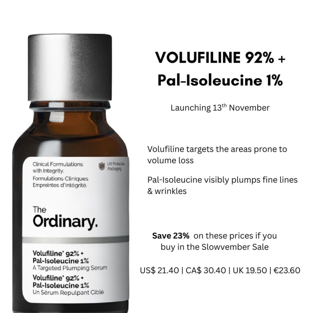 Сироватка для обличчя The Ordinary Volufiline 92% + Pal-Isoleucine 1% містить 92% Volufiline – відому технологію, яка зазвичай використовується для помітного збільшення об’єму та пружності шкіри. Вона розроблена для помітного зменшення втрати об’єму та покращення щільності шкіри. Формула спрямована на зменшення видимості ділянок, схильних до втрати об’єму.