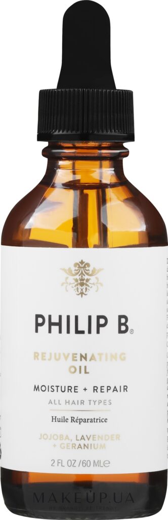 Один з бестселерів марки Philip B. – омолоджуюча олія – доглядає волосся і шкіру голови: омолоджує, регенерує, зволожує, живить, тонізує, нейтралізує негативний вплив навколишнього середовища, відновлює після хімічних завивок і навіть після тривалого перебування на сонці. У складі – цілий арсенал натуральних масел: оливкова, мигдальна, кунжутна, олії волоського горіха, жожоба, іланг-ілангу, герані, гарденії.