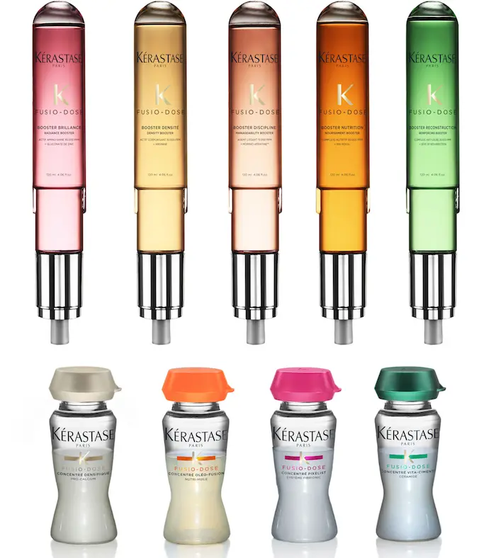 У Kerastase – чотири концентрати і п’ять бустерів, з яких виходить 20 засобів для догляду за волоссям. Так, за допомогою лінії Fusio-Dose можна розв’язати будь-яку проблему. Спочатку потрібно вибрати концентрат: Concentre Oleo-Fusion живить і пом’якшує сухе волосся, Concentre Pixelist захищає колір і посилює блиск фарбованого волосся, Concentre Vita-Ciment відновлює пошкоджене волосся з посіченими кінчиками, Concentre Densifique ущільнює і надає об’єму. І додати туди необхідний бустер – Booster Reconstruction для відновлення, Booster Discipline для догляду за неслухняним волоссям, Booster Brillance Radiance для надання блиску, Booster Densifique для більшого об’єму і Booster Nutrition для додаткового живлення.
