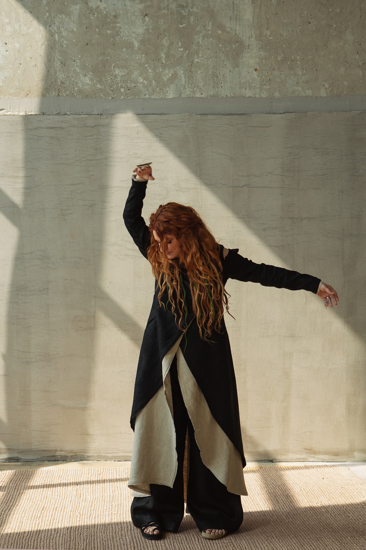 Для своей первой коллекции одежды Тата выбрала лен черного и натурального оттенков, прямые и многослойные модели, но самое главное – собственноручные рисунки, нанесенные на одежду с помощью древней техники линогравюры. На специальных дощечках Тата нарисовала карандашом цветы и птиц (как символ своего движения), после этого специальным резаком для линогравюр вырезала каждый элемент. Все рисунки в стилизованном этническом стиле были нанесены на лен вручную лично Татой. Это делает коллекцию не только лимитированной, но и эксклюзивной в своем производстве.